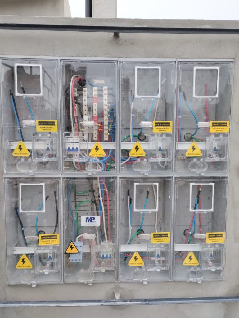 Instalação de quadro para medidores, padrões de entrada concessionaria, iluminação, aterramento e cabeamento.
